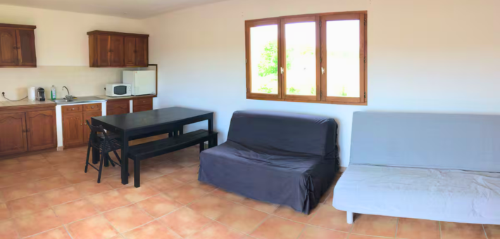 Le gîte est composé de 2 chambres principales avec dans chaque chambre : 1 lit double, 1 lit simple, 1 matelas au sol. Elles sont indépendantes l'une de l'autre ayant un accès à une cuisine commune. Chaque chambre dispose de sa salle de bain et de ses toilettes. La grande chambre dispose d'une petite terrasse. La cuisine est équipée.