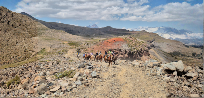 Dernier jour de notre randonnée équestre au Chili avec des paysages toujours plus extraordinaires. Nous visitons le site le plus emblématique du parc national : l'Enladrillado, un grand plateau de forme particulière, composé de de roche d’origine volcanique. Ce site est impressionnant par sa taille et ses formes géométriques naturelles. Lorsque le temps est dégagé, ce plateau nous permet d'apercevoir le chemin parcouru durant cette semaine.