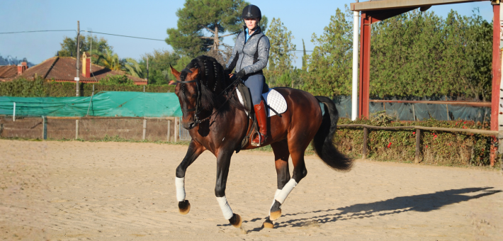 Puis, il est temps de nous mettre en selle pour notre première séance à cheval. Ce premier cours sert d’évaluation pour notre instructeur, qui pourra nous situer en termes de niveau, de points forts et de points d’amélioration. C’est aussi l’occasion de découvrir et se mettre en confiance avec notre cheval, et plus généralement avec une façon de monter très fine pour les chevaux ibériques et andalous. L’objectif de chaque cours sera de nous aider à nous améliorer et à passer un bon moment à cheval.