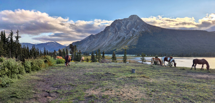Nous nous remettons en selle aujourd’hui, bien reposés et sans cheval de bât. Nous partons pour une belle journée de randonnée autour du lac. Nous chevauchons le long de la berge et en forêt. En nous éloignant du campement, nous aurons peut-être la chance d’observer des animaux sauvages : mouflons, élans, grizzli…