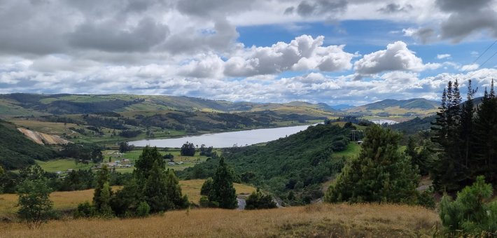 Nous retrouvons les chevaux et nos guides près du barrage de Sisga, à une heure de Bogotá. Nous commençons notre randonnée par la vallée de la rivière Sisga jusqu’à son confluent avec la rivière Bogotá, dont les eaux sont ici cristallines et riches en vie aquatique. Nous empruntons ensuite un sentier de montagne jusqu’au lac Suesca, d’où nous admirons le versant nord de la savane de Bogotá et le réservoir de Tominé en arrière-plan.
